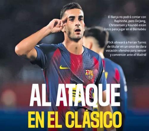 本周日23点15分,西甲第10轮打响国家德比,皇马主场迎战巴萨。10月25日,《每日体育报》头版头条报道指出,巴萨主帅弗里克已经敲定前场三叉戟,25岁的费兰-托雷斯出任中锋。费兰一共3次洞穿皇马大门,这次国家德比,25岁的巴萨中锋,期待4杀皇马。