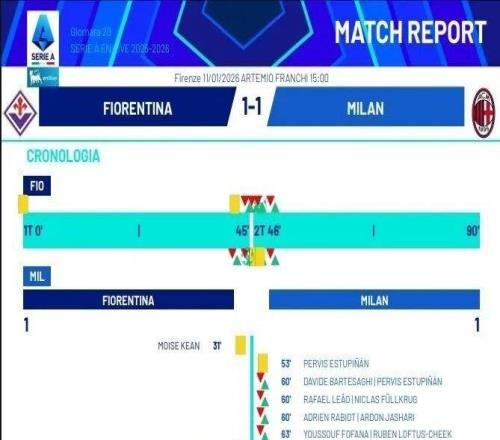 米兰圈在佛罗伦萨1-1战平米兰后,裁判报告显示阿莱格里遭到驱逐。裁判报告底部显示,佛罗伦萨主帅瓦诺利和米兰主帅阿莱格里都吃到了红牌。直播镜头并未显示阿莱格里拿到红牌的