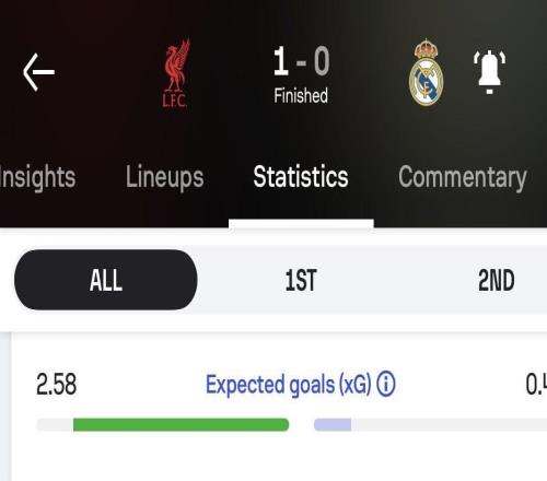 北京时间11月5日,在欧洲冠军联赛阶段第4轮的对决中,利物浦以1-0战胜皇家马德里。赛后,知名统计机构Sofascore Football给出了皇马的预期进球,皇马最近四年欧冠对阵英超球队预期