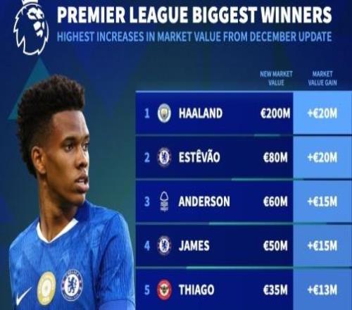英超球员身价涨幅榜:哈兰德、埃斯特旺上涨2000万欧,安德森、里斯詹姆斯上涨1500万欧